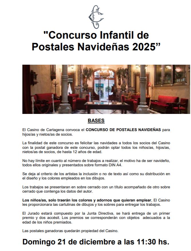 Este próximo domingo 21 de diciembre y a partir de las 11.30 horas, se realizará el tradicional «CONCURSO DE POSTALES NAVIDEÑAS DEL CASINO DE CARTAGENA» en el que podrán participar los niños de hasta 12 años, hijos y nietos de nuestros socios, y en el cual se decidirá, entre las postales dibujadas por los niños, la que servirá como postal navideña del Casino para 2026. En la carta adjunta tienen más información.