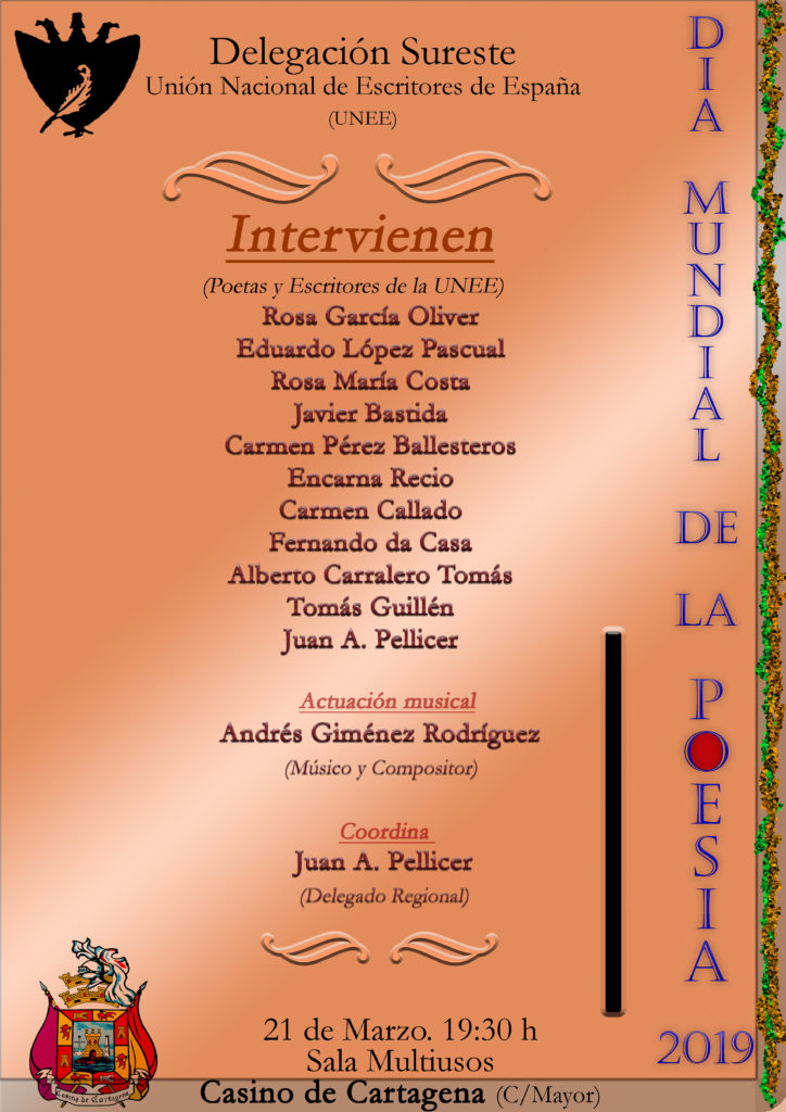 A cargo de la Unión Nacional de Escritores de España (UNEE), con la intervención de Escritores y Poetas como Rosa García Oliver, Javier Bastida, Juan A. Pellicer… y la actuación musical de Andrés Giménez Rodríguez, músico y compositor.