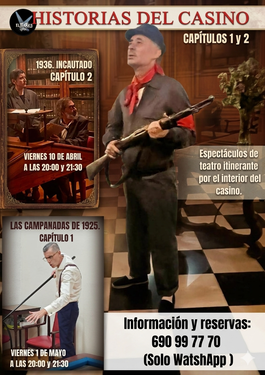 La compañía de teatro El teatrico estudio representará el capítulo número 2 de la obra teatral Historias del Casino. Este capítulo tiene como título 1936. Incautado, y se desarrollará en distintas estancias de nuestra Sociedad. Debido al formato de la obra, que va realizándose por varias salas, el aforo es limitado. Será el viernes 10 de abril a las 20 horas y 21:30 horas. El precio para los socios del Casino es de 12€ por persona. Para las personas que no son socias el precio es de 15€. Si usted quiere reservar, puede hacerlo escribiendo un mensaje de Whatsapp al número de teléfono 690 99 77 70 o escribiendo al correo electrónico elteatricoestudio@hotmail.com indicando que es socio del Casino de Cartagena.