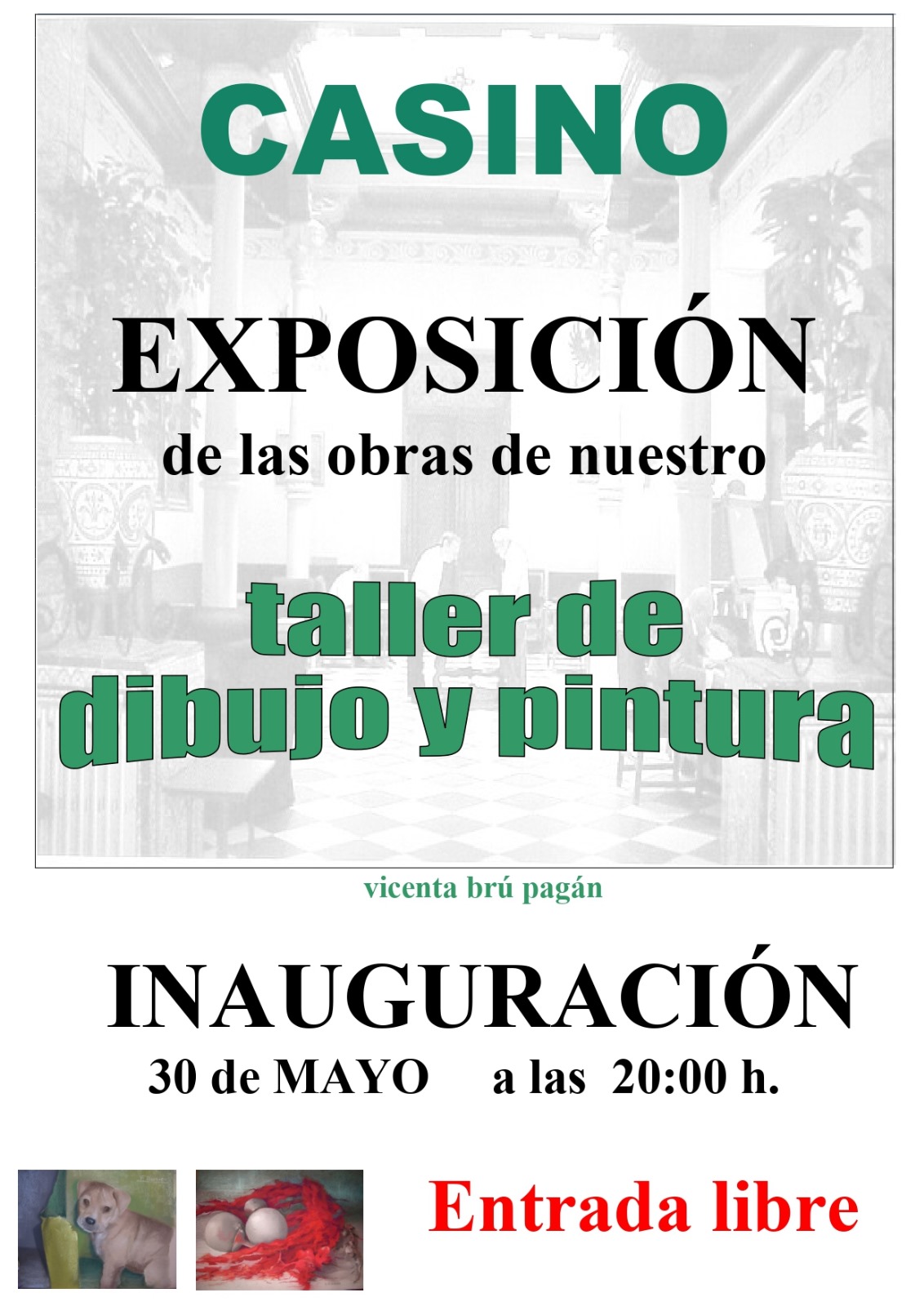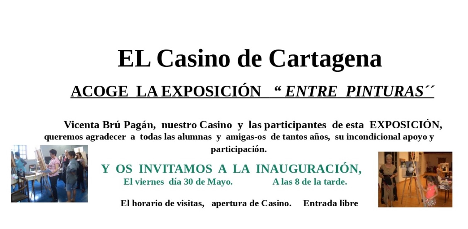 Este viernes día 30, en el salón multiusos de nuestra Sociedad y a partir de las 20 horas, inauguración de la exposición «Entre pinturas» donde se expondrán las obras que se han realizado durante estos últimos años en el taller de dibujo y pintura que se ha realizado en el Casino de Cartagena de la mano de la profesora Vicenta Bru.