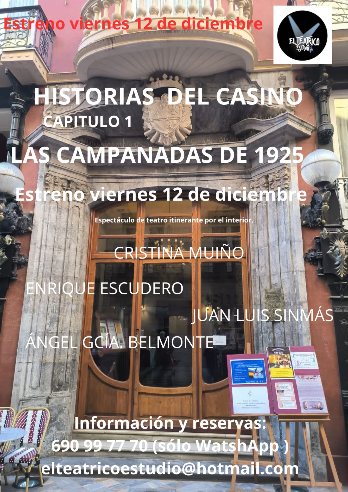 La compañía de teatro El teatrico estudio presenta el capítulo número 1 de la obra teatral Historias del Casino. Este primer capítulo tiene como título Las campanadas de 1925, y se desarrollará en distintas estancias de nuestra sociedad. Debido al formato de la obra, que va realizandose por distintas salas, el aforo es limitado, pero el viernes 12 de diciembre habrá un pase especial para los socios del Casino al precio de 12€ por persona. Si usted quiere reservar, puede hacerlo escribiendo un mensaje de Whatsapp al número de teléfono 690 99 77 70 o escribiendo al correo electrónico elteatricoestudio@hotmail.com