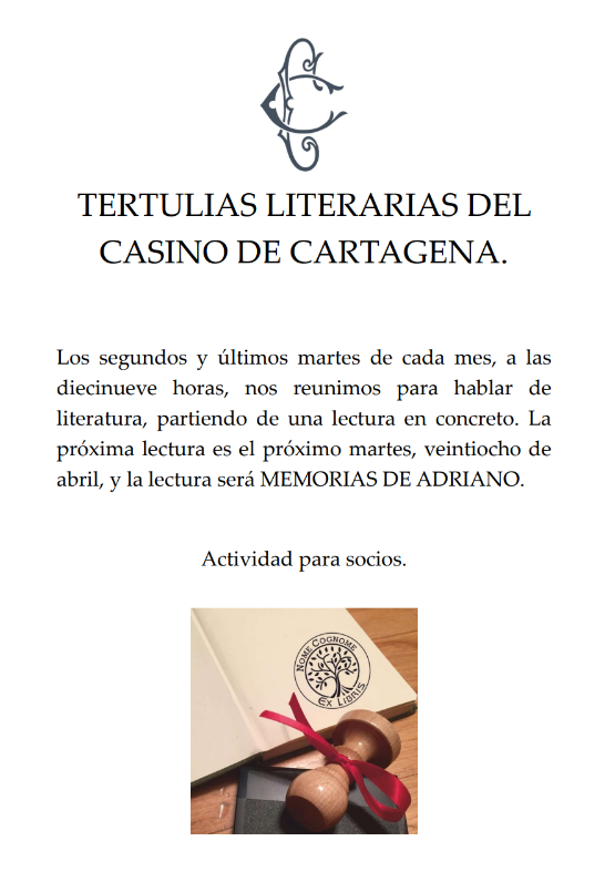 El próximo martes, día 28 de abril, a las 19 horas, se realizará la tertulia literaria en el Casino de Cartagena.