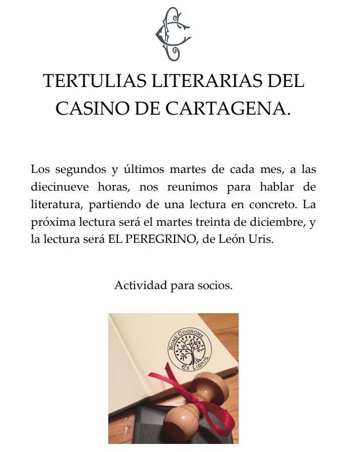 El próximo martes, día 30 de diciembre, a las 19 horas, se realizará la tertulia literaria en el Casino de Cartagena.